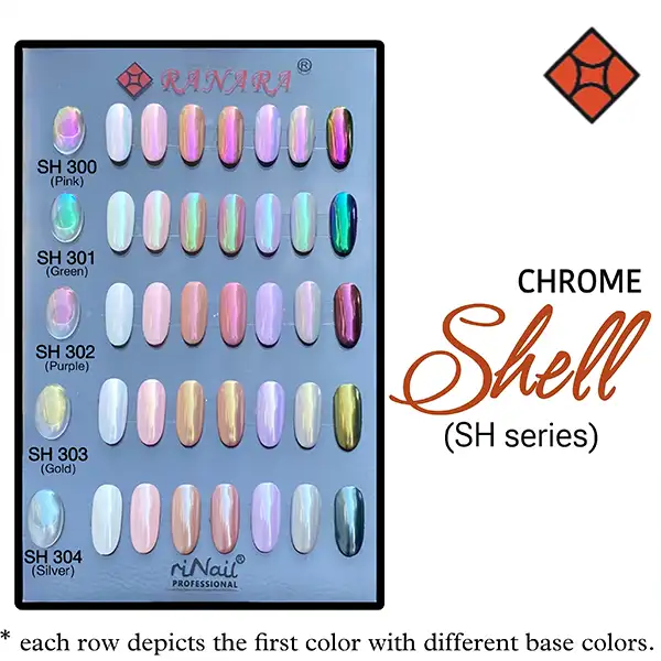 The Ranara Chrome Shell SH Series is a sophisticated collection of transparent chromes that provide a soft, iridescent reflection without overpowering the base color. Unlike opaque chromes, these powders allow your underlying gel color to shine through while adding a shimmering, shell-like metallic glow on top.
