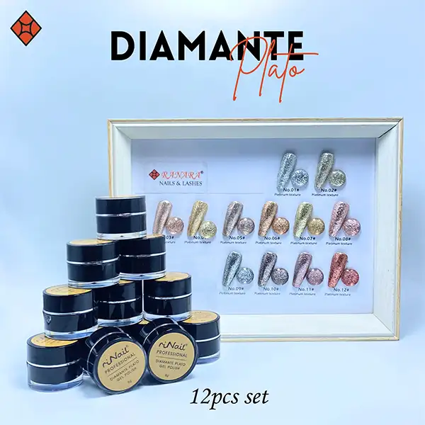 The Ranara Rinail Diamante Plato Gel Kit is a dazzling collection of 12 intense glitter gels, carefully curated for those who love adding a touch of sparkle to their nail designs. Housed in elegant jars, these high-pigment gels deliver an eye-catching, glittering finish that can be used both as gel polish and for intricate nail art.