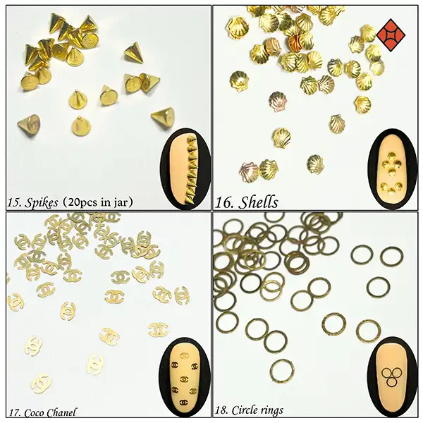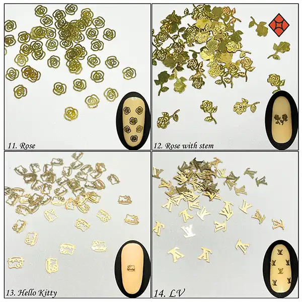 Mermaid, Butterfly A, Butterfly B, Butterfly C, Hearts, Stars, Swirls S, Triangle, Bows, Ribbon, Rose, Rose with Stem, Hello Kitty, LV, Spikes, Shells, Coco Channel, Circle Rings
