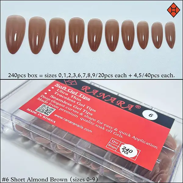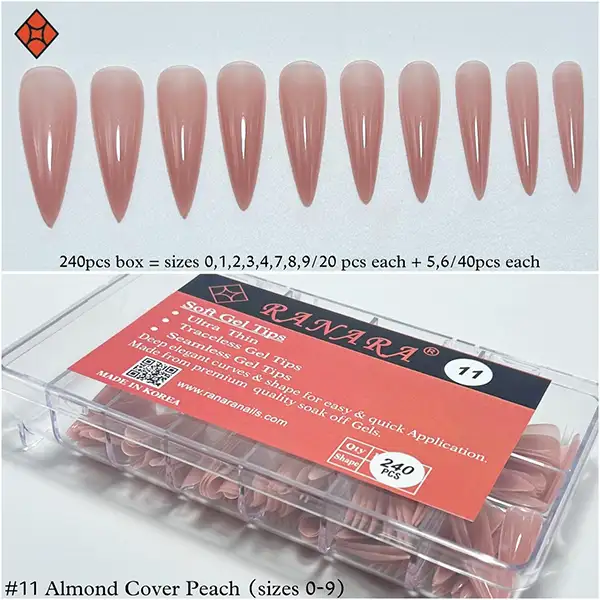 Ranara Softgel Tips in Colored Nudes are pre-colored, gel-based tips available in two elegant shapes: Almond and Short Almond. These tips combine the strength and structure of gel extensions with the refined finish of nude tones, eliminating the need for additional polish or color after application.