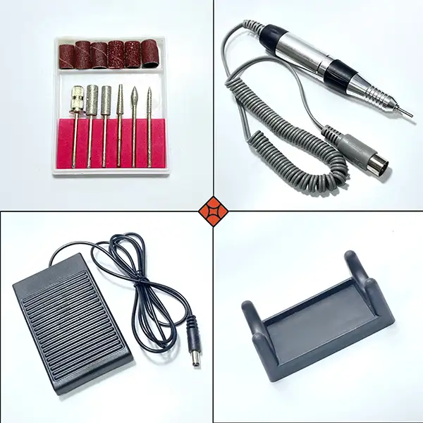 The machine comes with a handpiece holder, allowing users to place the drill securely when not in use, which helps maintain a tidy workspace. Additionally, it includes a foot pedal, enabling hands-free operation. This feature is particularly beneficial for professionals who need to multitask, as it allows for seamless transitions between different nail services while maintaining optimal control over the drill.