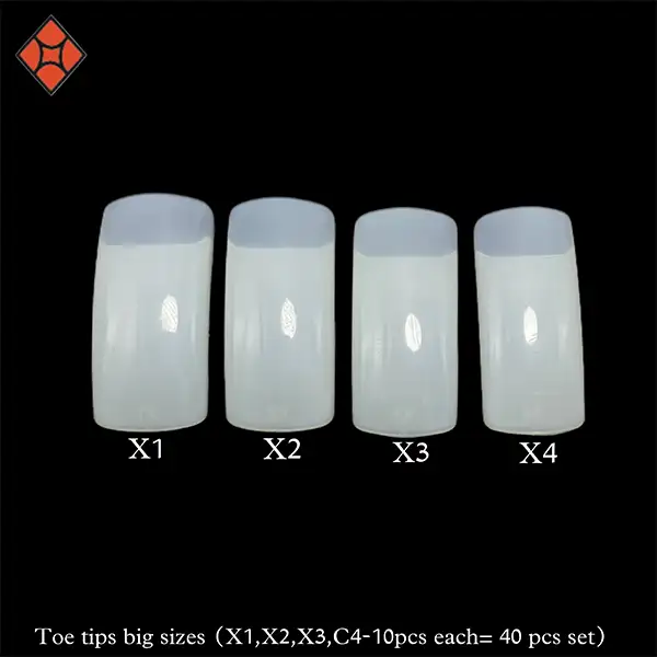 Introducing Ranara Toe Tips, expertly crafted from high-quality ABS plastic, ensuring they are made from virgin material for optimal durability and flexibility. These tips are designed to provide a soft and comfortable fit, making them easy to apply for beautiful toenail enhancements. Each package contains 40 pieces in total, with sizes ranging from X1 to X4, featuring 10 pieces of each size, specifically tailored for larger toe nails.