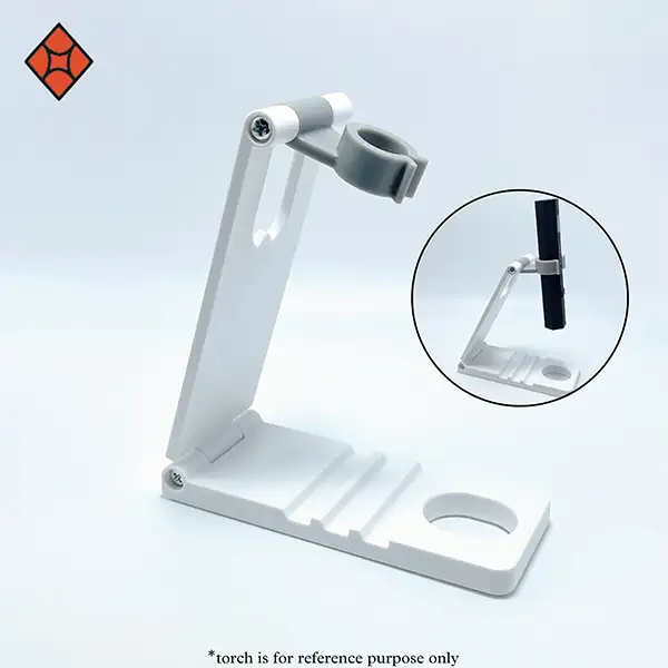 Additionally, the torch lamp stand features a mobile stand on the lower surface, complete with two dedicated grooves designed to hold your mobile device. This convenient feature allows you to keep your phone within reach, making it easy to reference designs or follow tutorials while you work.